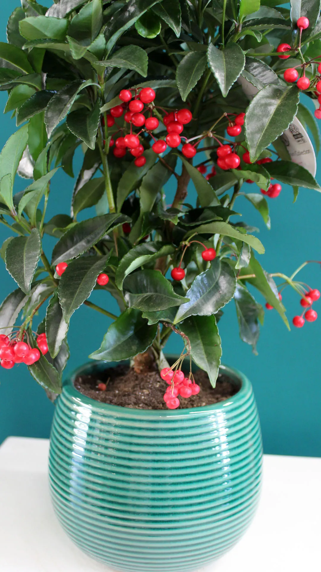 Impressive shrub with red fruits that last almost all year round. Water once the soil is dry.