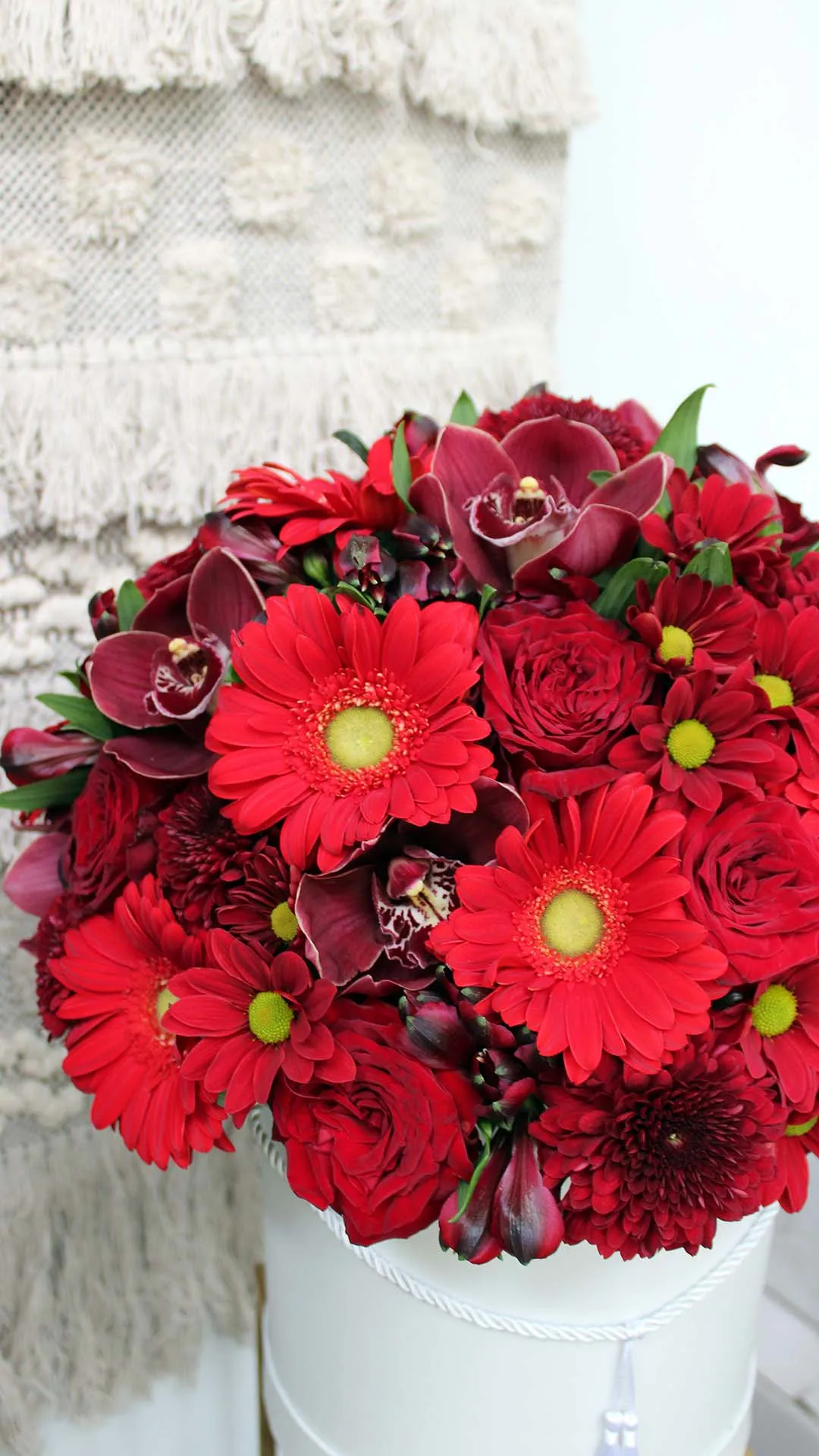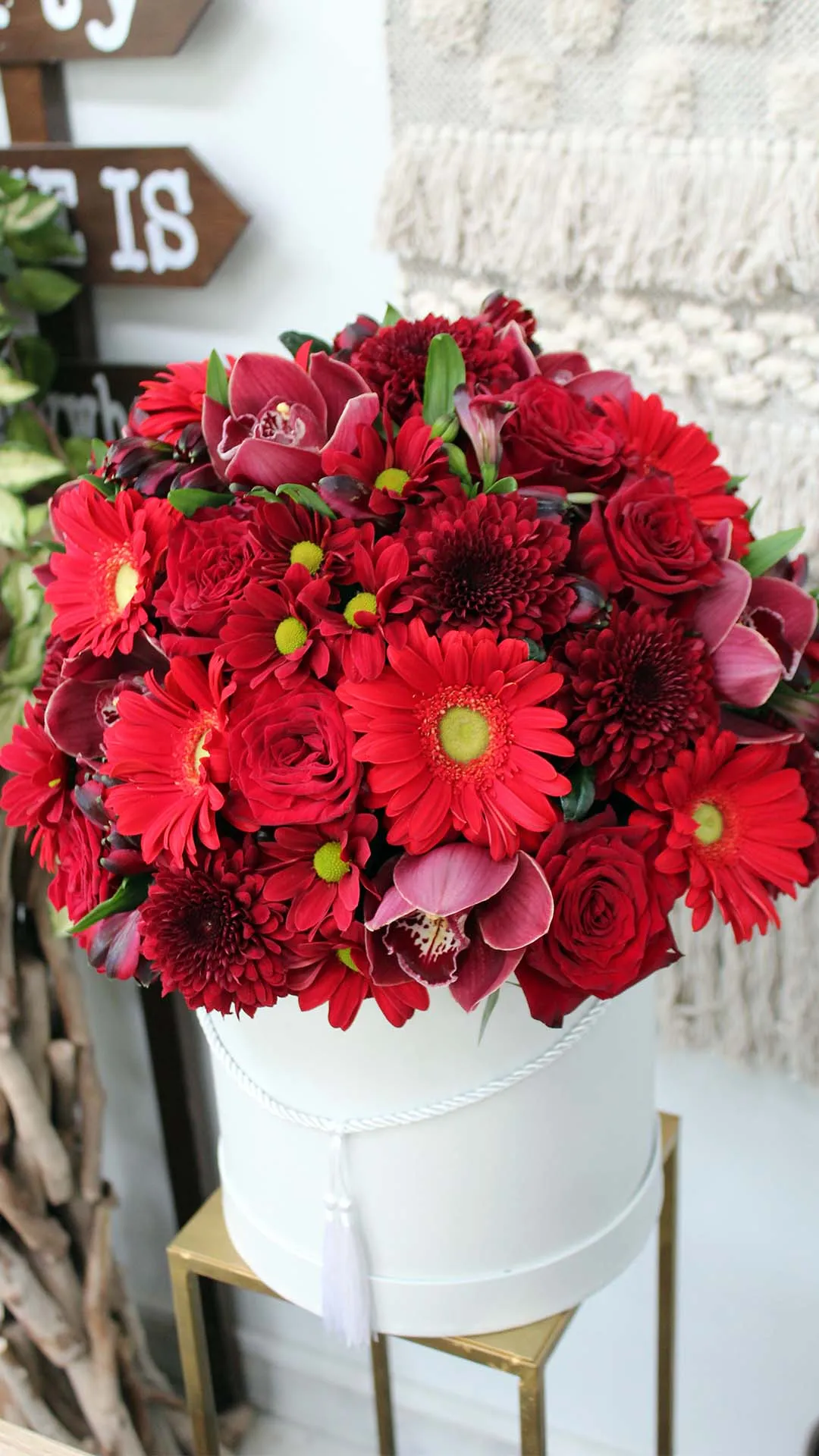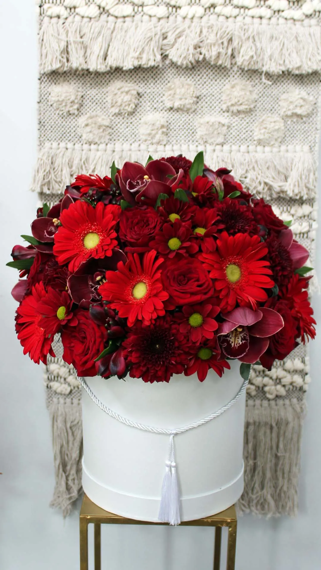 Tall white hatbox featuring a stunning arrangement in shades of red. Orchids, chrysanthemums, roses, alstroemerias, and gerberas beautifully arranged in a luxury box.