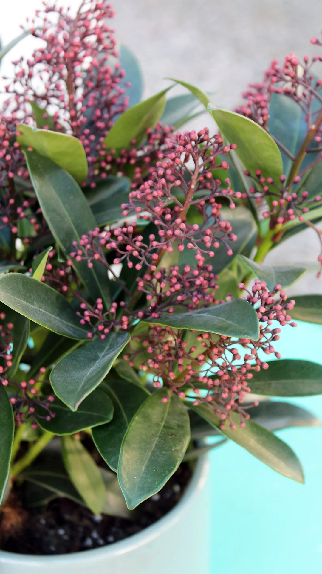 Skimmia japonica transplanted in a pot. Place it in a very bright place inside the house or ideally outside as it loves coolness.