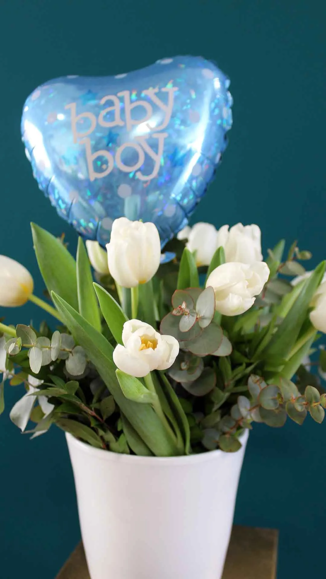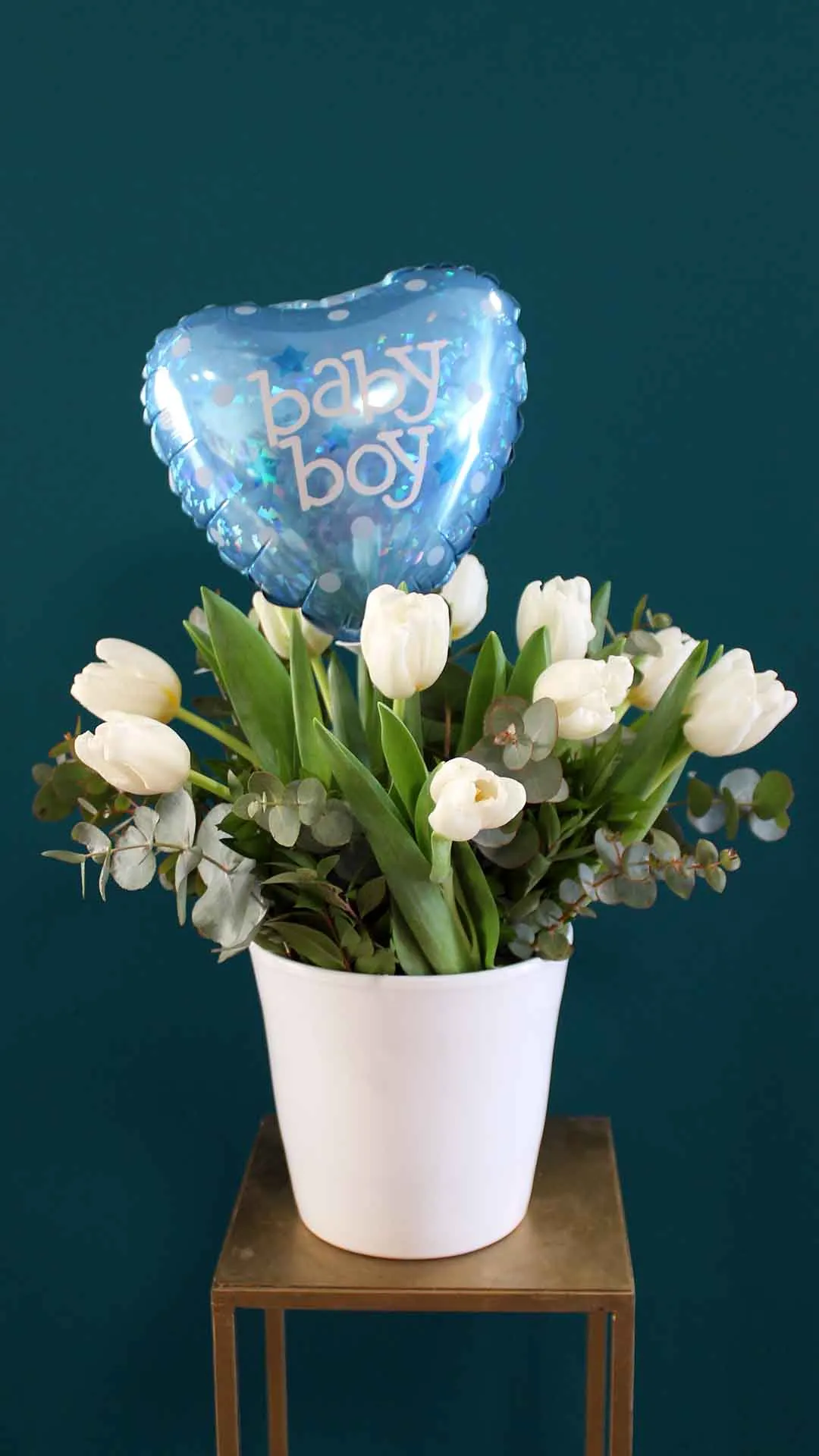 10 white tulips with greenery in a white ceramic pot with balloon baby boy!