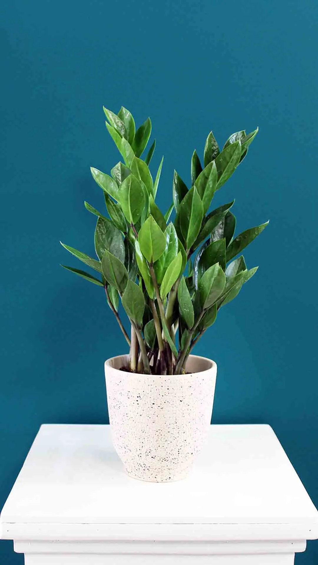 Zamioculcas in beige ceramic pot. It is a houseplant that can live in several shady spots. Probably the most durable houseplant. Watering once every 90 days depending on the atmospheric humidity. When it grows long enough shoots of, the weight of the stem bend. It is preferable to cut than to put braces. This is because the tubers in the soil may have to be injured.