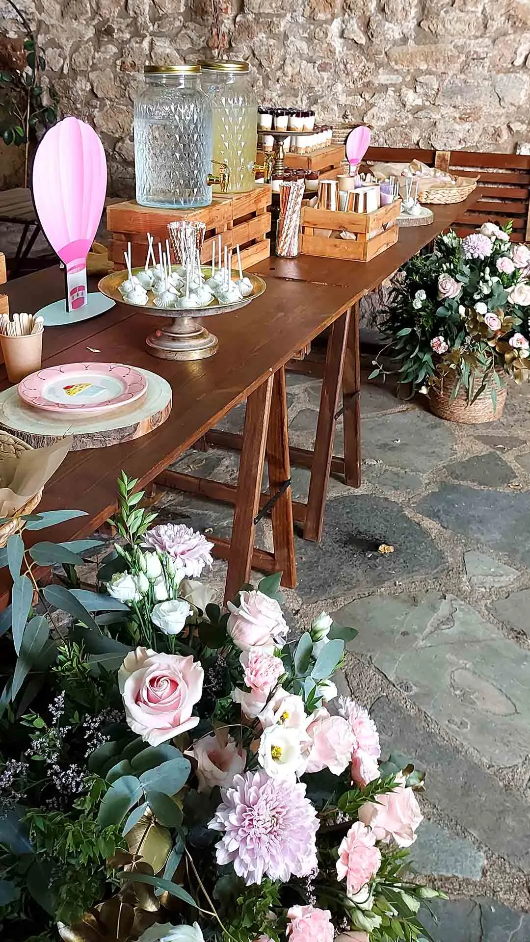 Η διακόσμηση βάπτισης με λουλούδια σε ροζ αποχρώσεις και θέμα τα αερόστατα δημιουργεί ένα παραμυθένιο σκηνικό γεμάτο ρομαντισμό και κομψότητα. Η κολυμπήθρα στολίζεται με αέρινες συνθέσεις από τριαντάφυλλα, χρυσάνθεμα και λυσίανθους σε παστέλ τόνους, ενώ εντυπωσιακά καλάθια με φρέσκα λουλούδια πλαισιώνουν την είσοδο της εκκλησίας. Το candy bar ακολουθεί την ίδια θεματική, διακοσμημένο με μικρά αερόστατα, ροζ κορδέλες και γλυκές λιχουδιές που συμπληρώνουν την ονειρική ατμόσφαιρα της ημέρας.