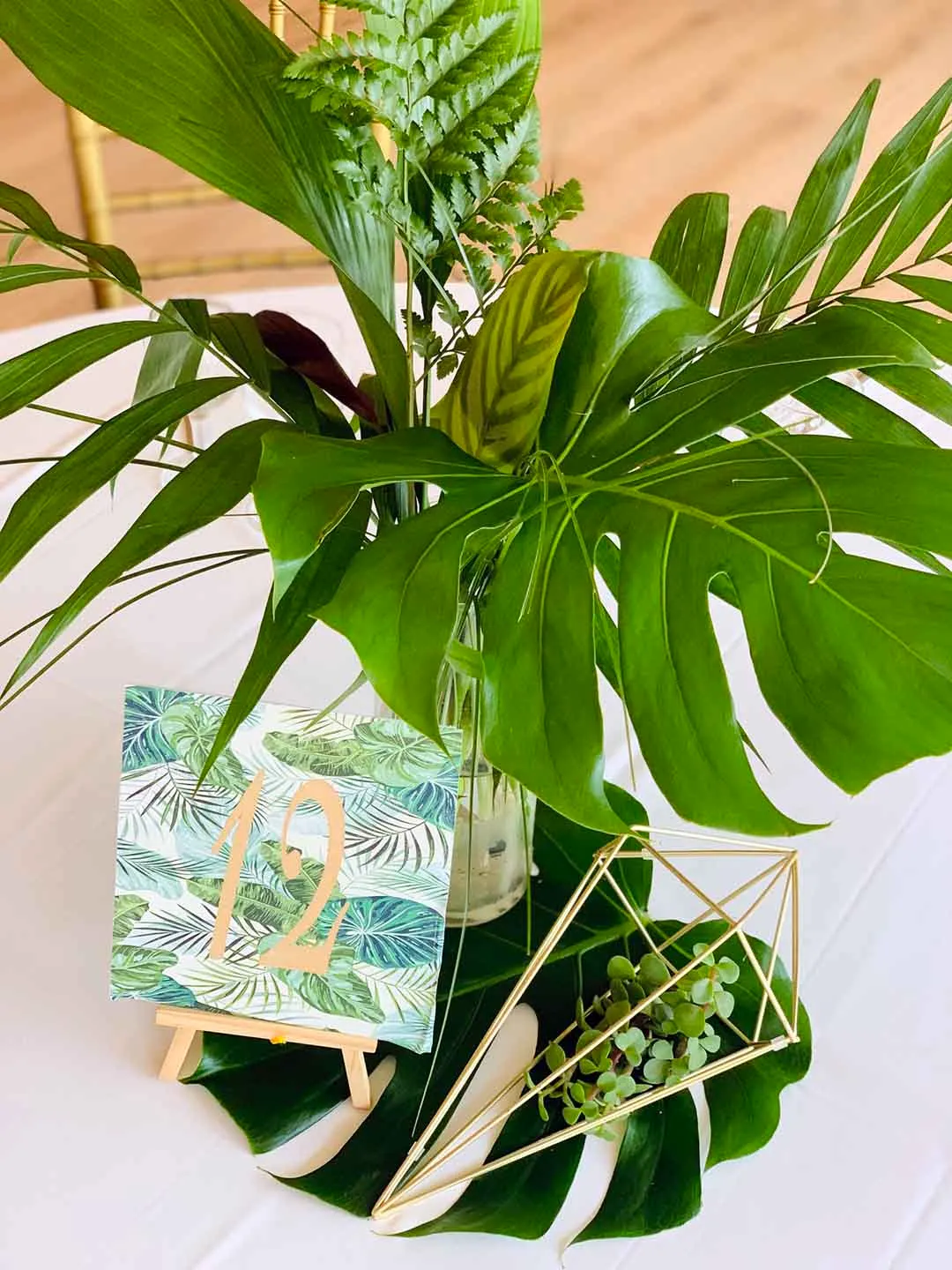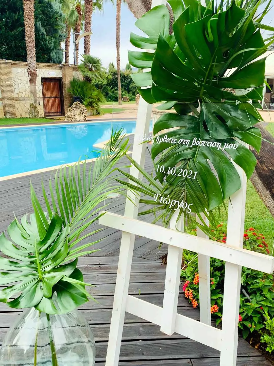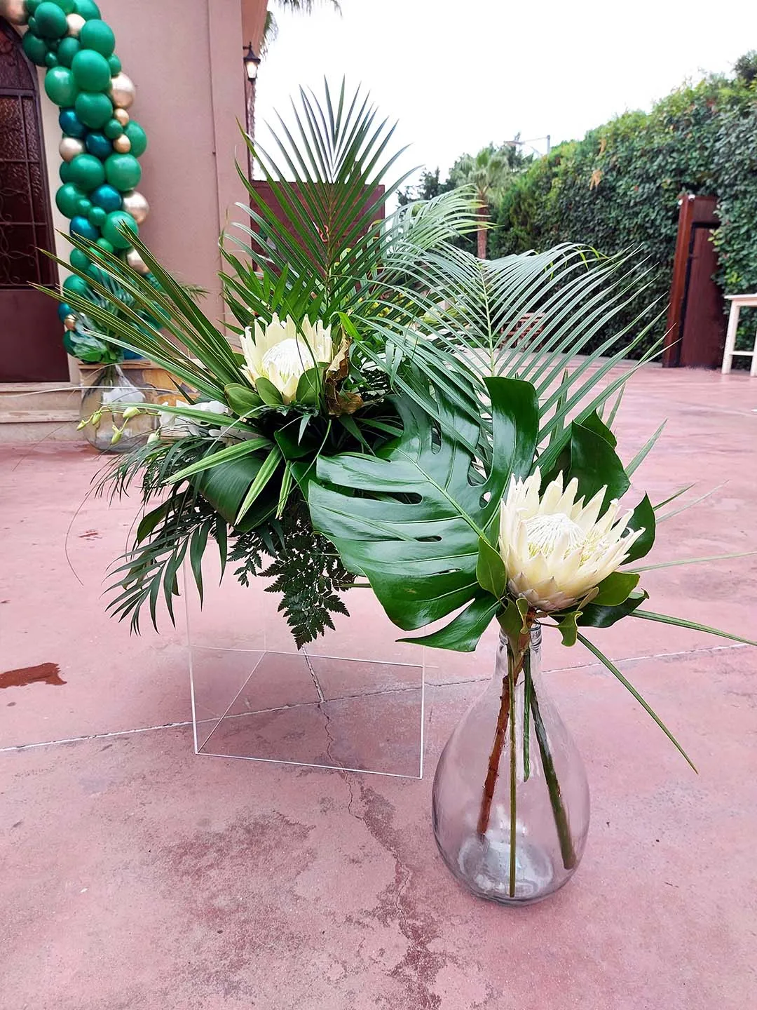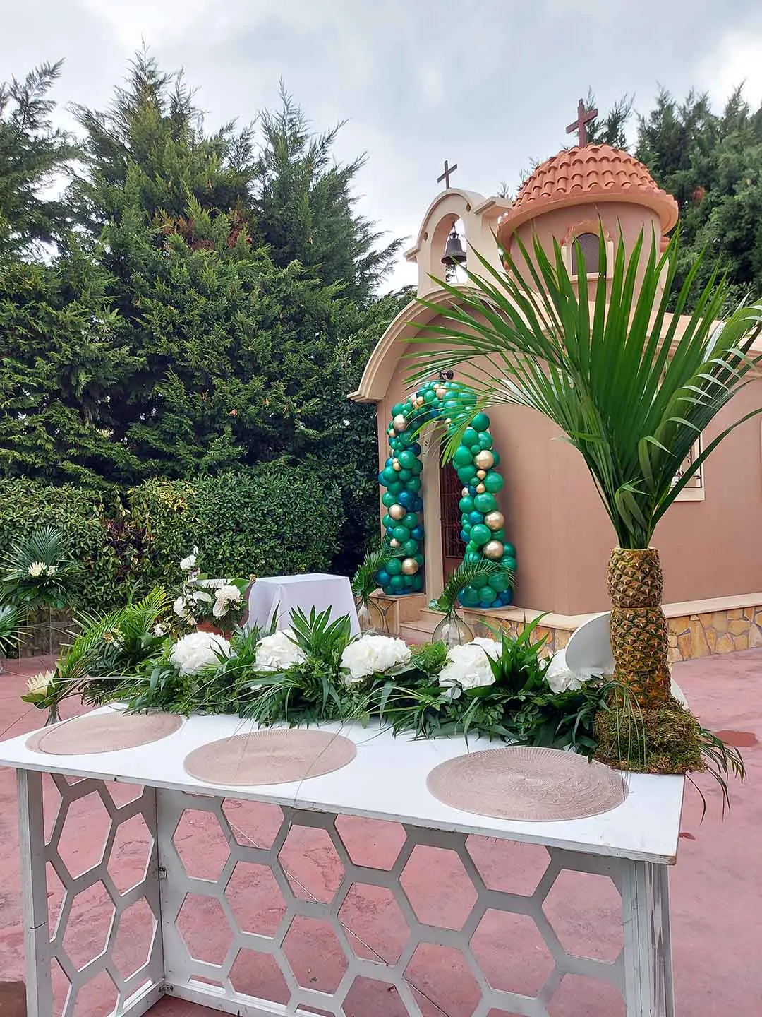Τροπική και chic η διακόσμηση αυτής της βάπτισης αγοριού! Διάφορα φυλλώματα, ιδιαίτερα βοτανικά υλικά, πρωτέες και παχύφυτα, χρησιμοποιήθηκαν στον ανθοστολισμό.