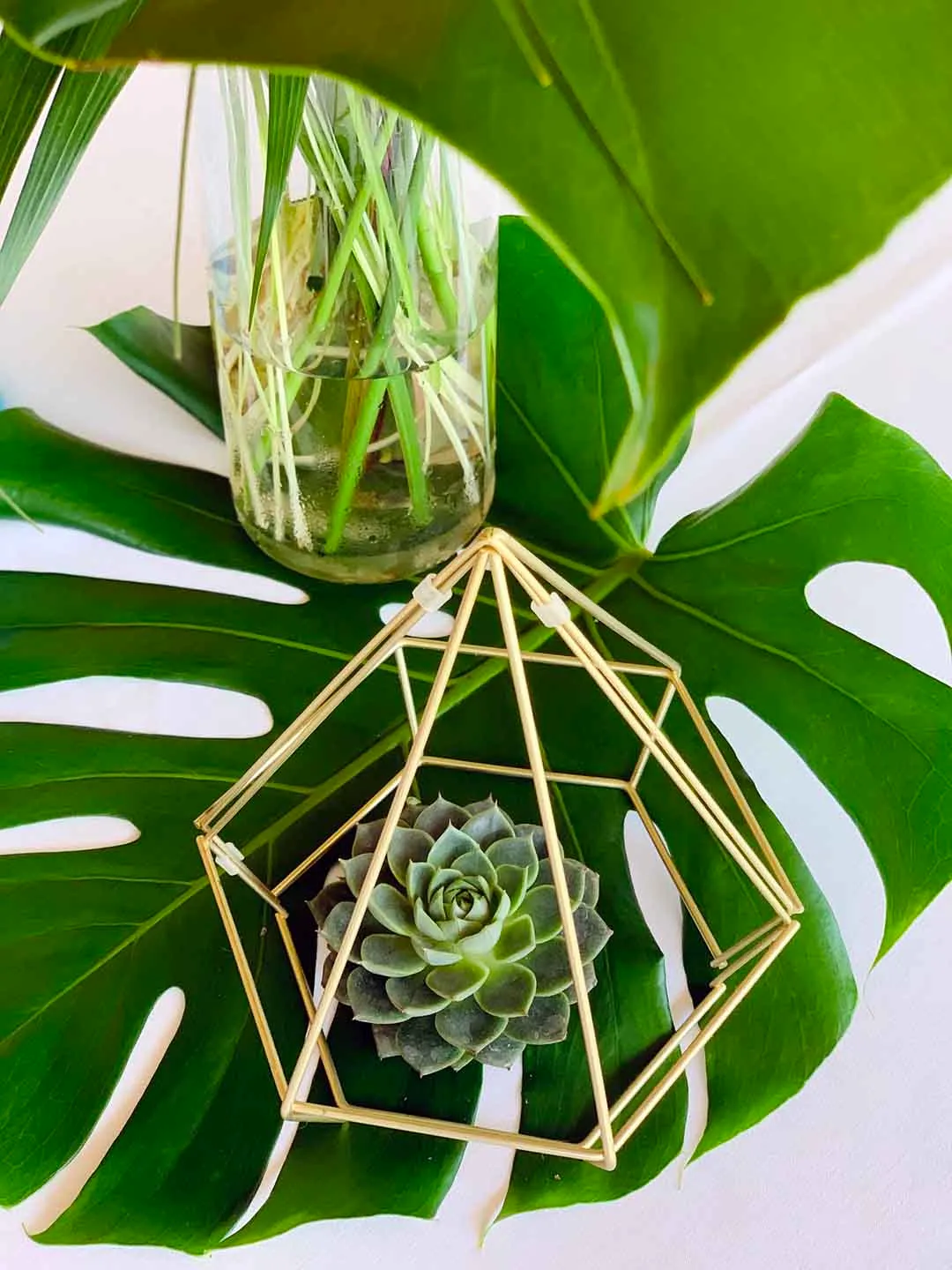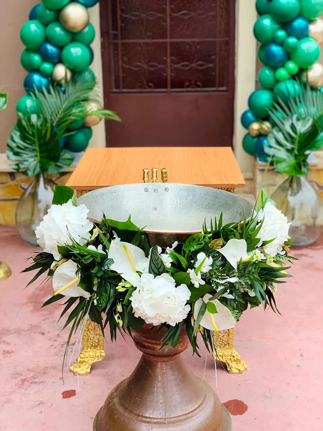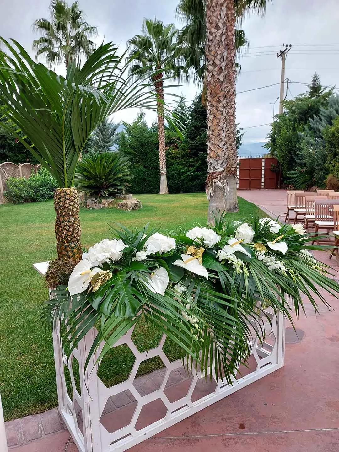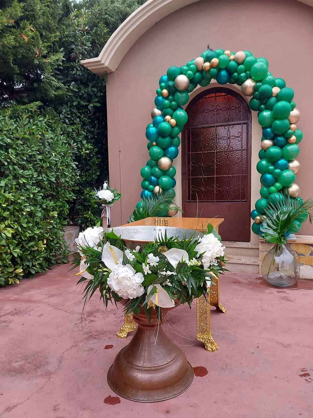Τροπική και chic η διακόσμηση αυτής της βάπτισης αγοριού! Διάφορα φυλλώματα, ιδιαίτερα βοτανικά υλικά, πρωτέες και παχύφυτα, χρησιμοποιήθηκαν στον ανθοστολισμό.