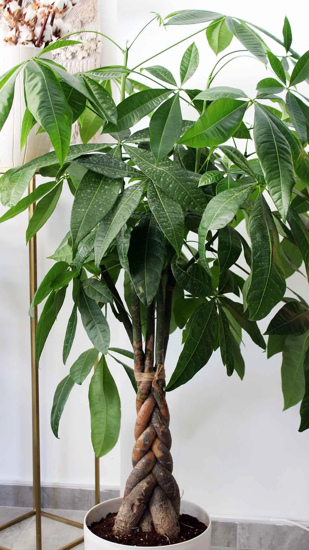 Ψηλή παχίρα μεταφυτευμένη σε πλαστική γλάστρα εξαιρετικής ποιότητας σε λευκό ματ χρώμα.
