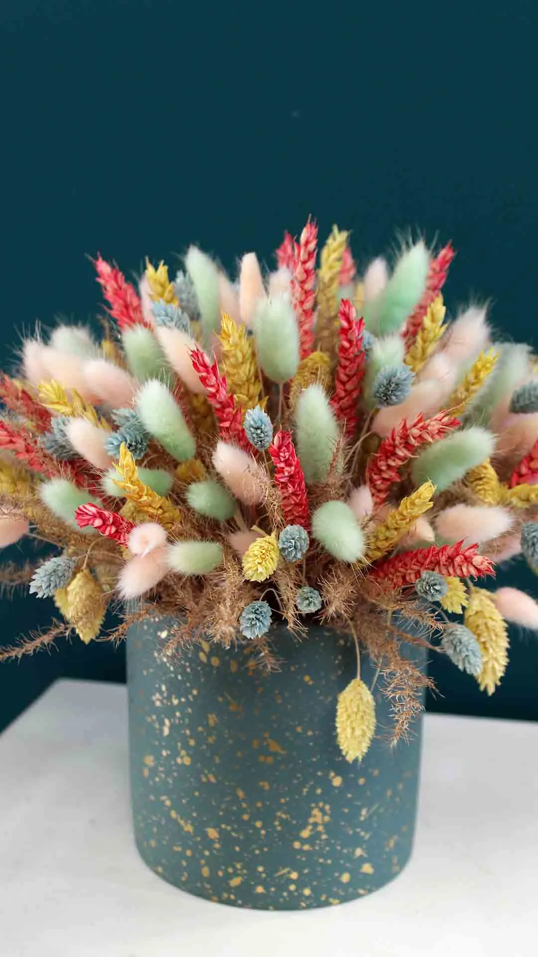 Σύνθεση πολύχρωμων αποξηραμένων λουλουδιών σε πετρόλ κεραμικό κασπό.