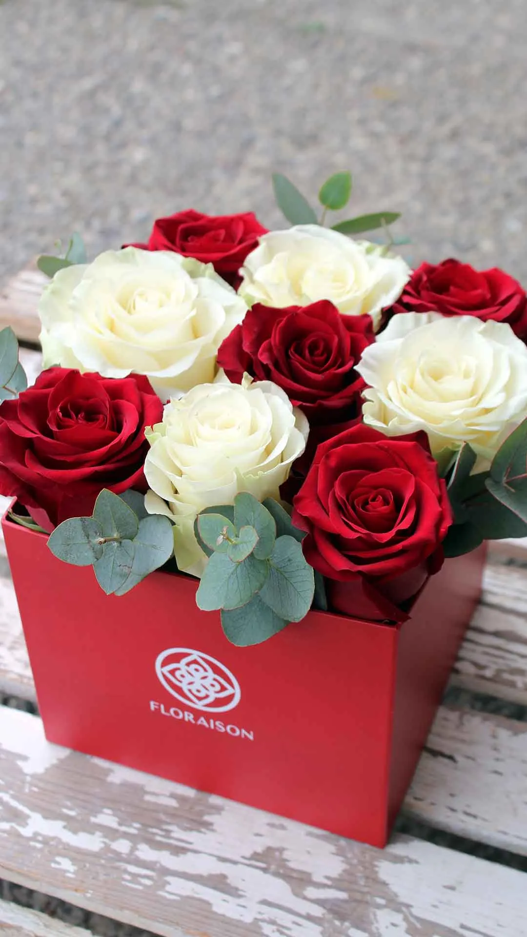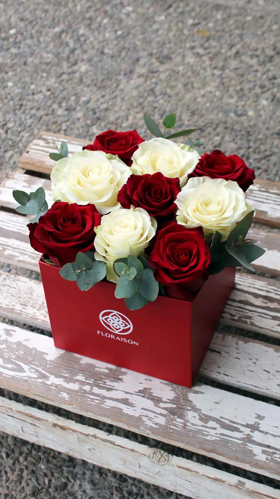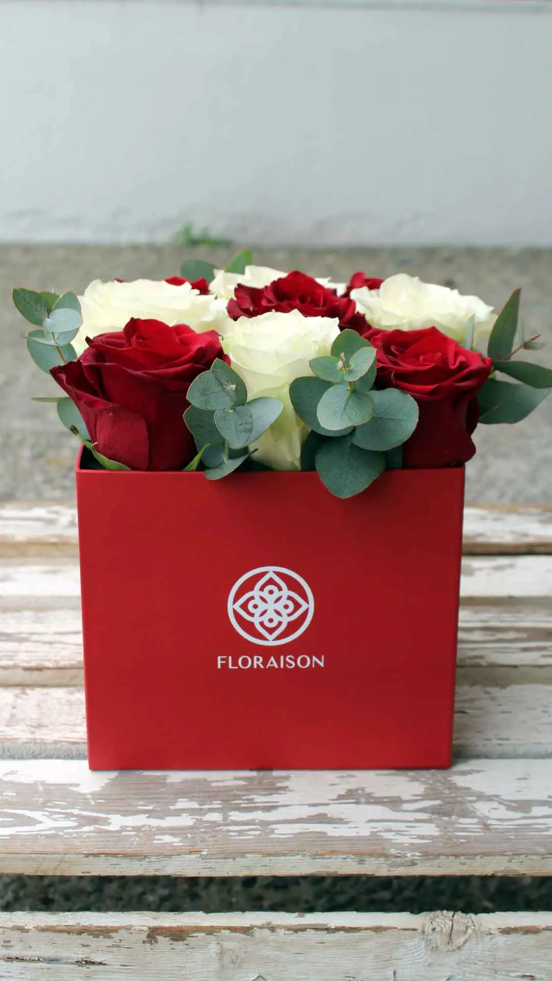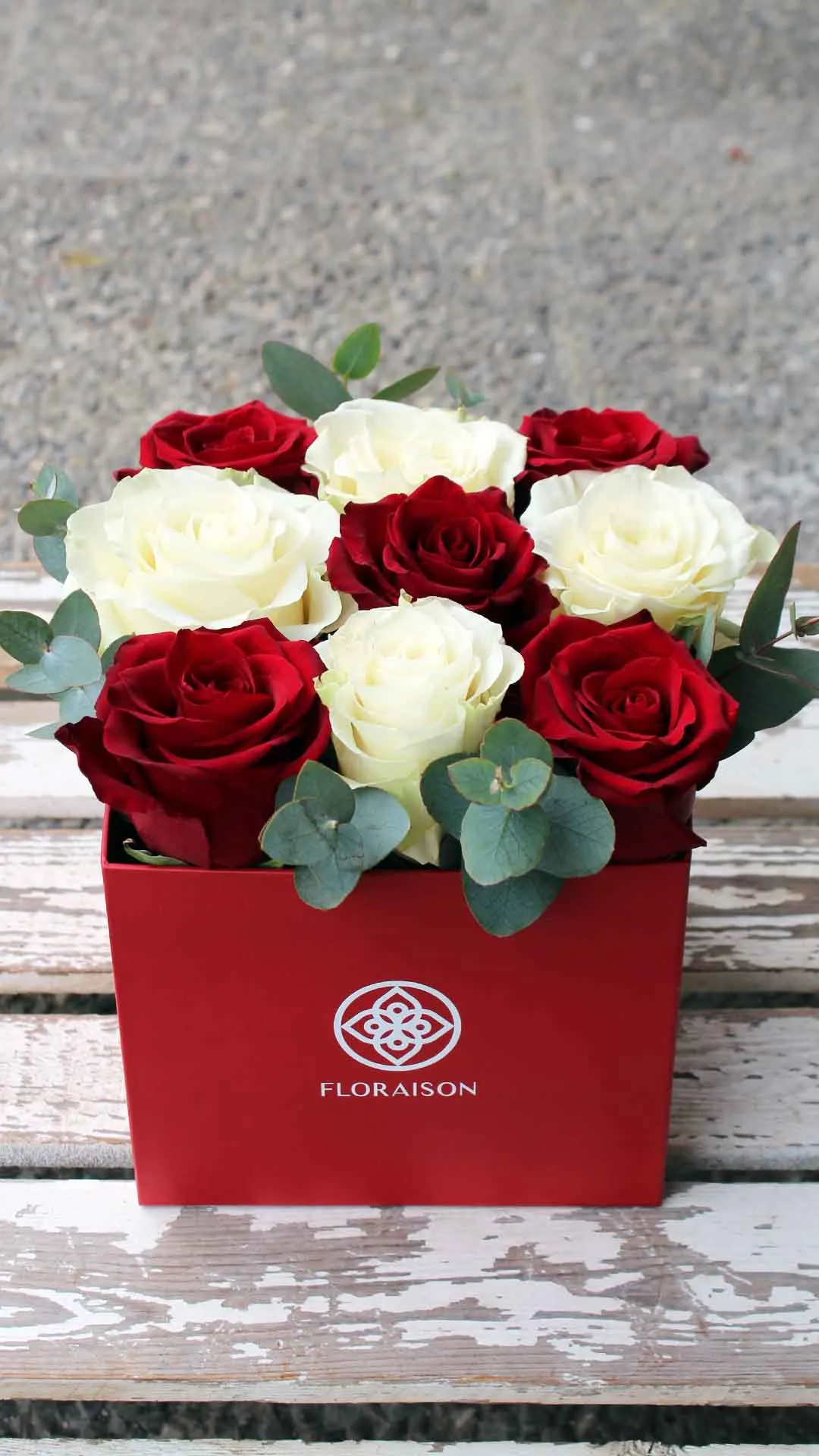 Όμορφα τριαντάφυλλα εισαγωγής κόκκινα και λευκά, με διακόσμηση από ευκάλυπτο, σε κόκκινο κουτί.